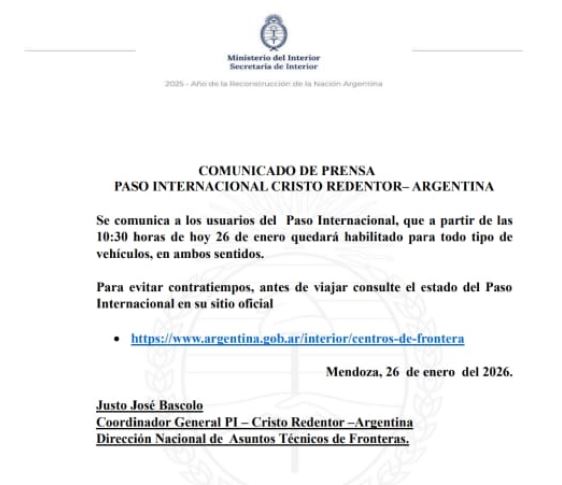 El Paso Cristo Redentor ya se encuentra habilitado luego de intensas tormentasRedacción LVDiez